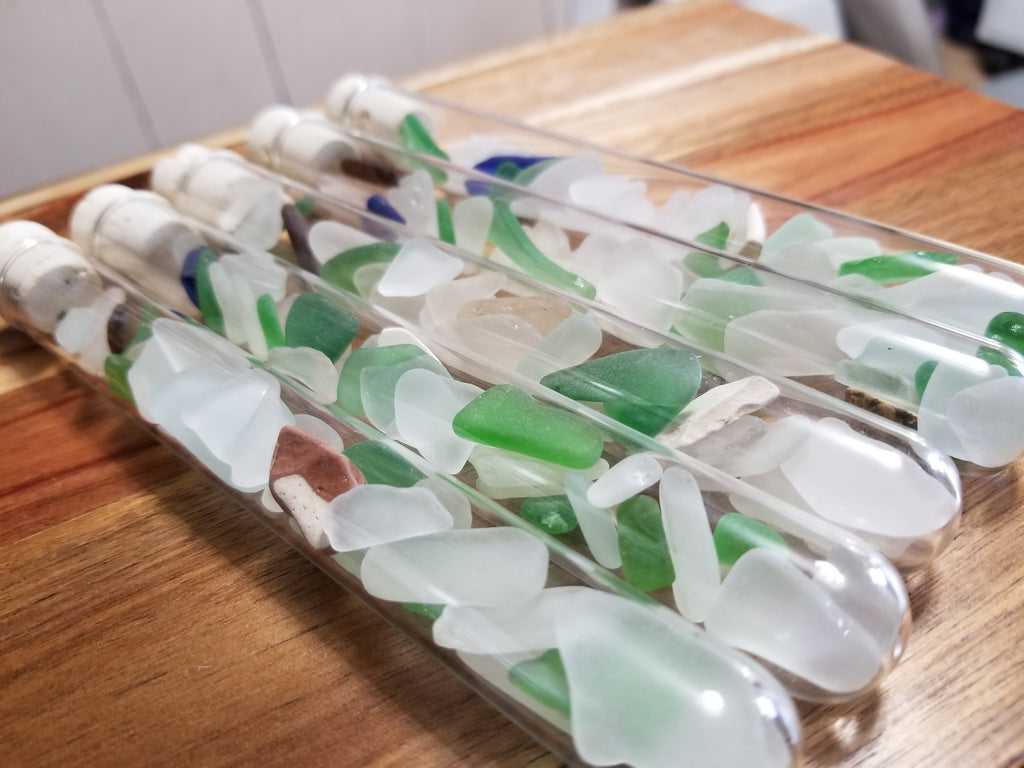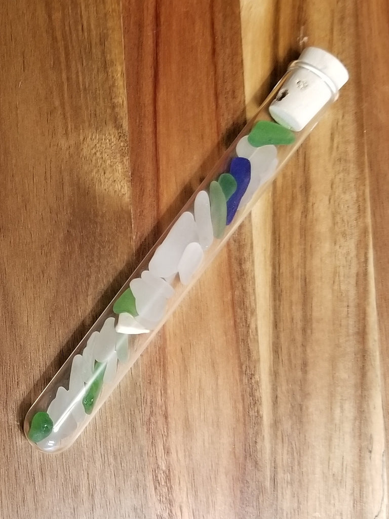 From the Cape Breton coast, a vial of beautiful sea glass with a mixture of whites, greens, blue, brown and a piece of pottery!