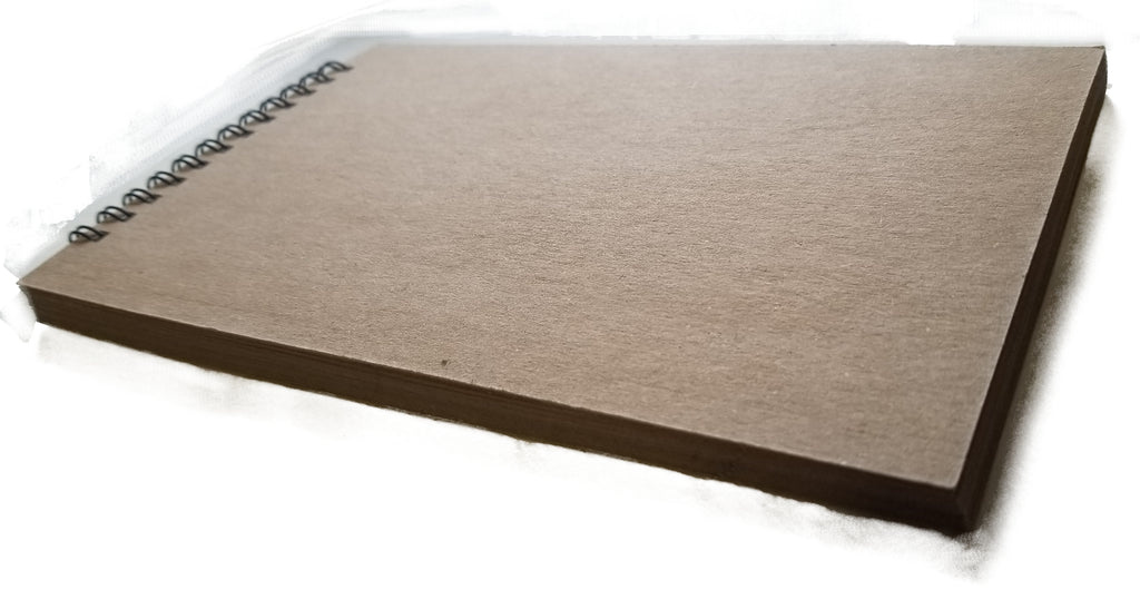 5.5" x 8.5" Natural Kraft 50lb. Recycled Paper Sketchbook bound with metal wrap around coil for a comfortable lay flat booklet.